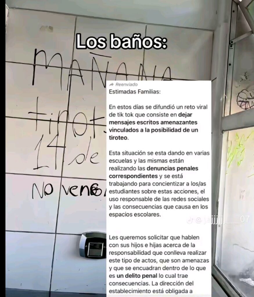 La situación ya impacta en distintos puntos de la provincia de Buenos Aires y el país, y tuvo su correlato en Rauch, donde un establecimiento educativo debió intervenir de manera inmediata.En el Instituto Inmaculada Concepción fue hallado en un baño un mensaje con la frase:“Tiroteo mañana viernes”