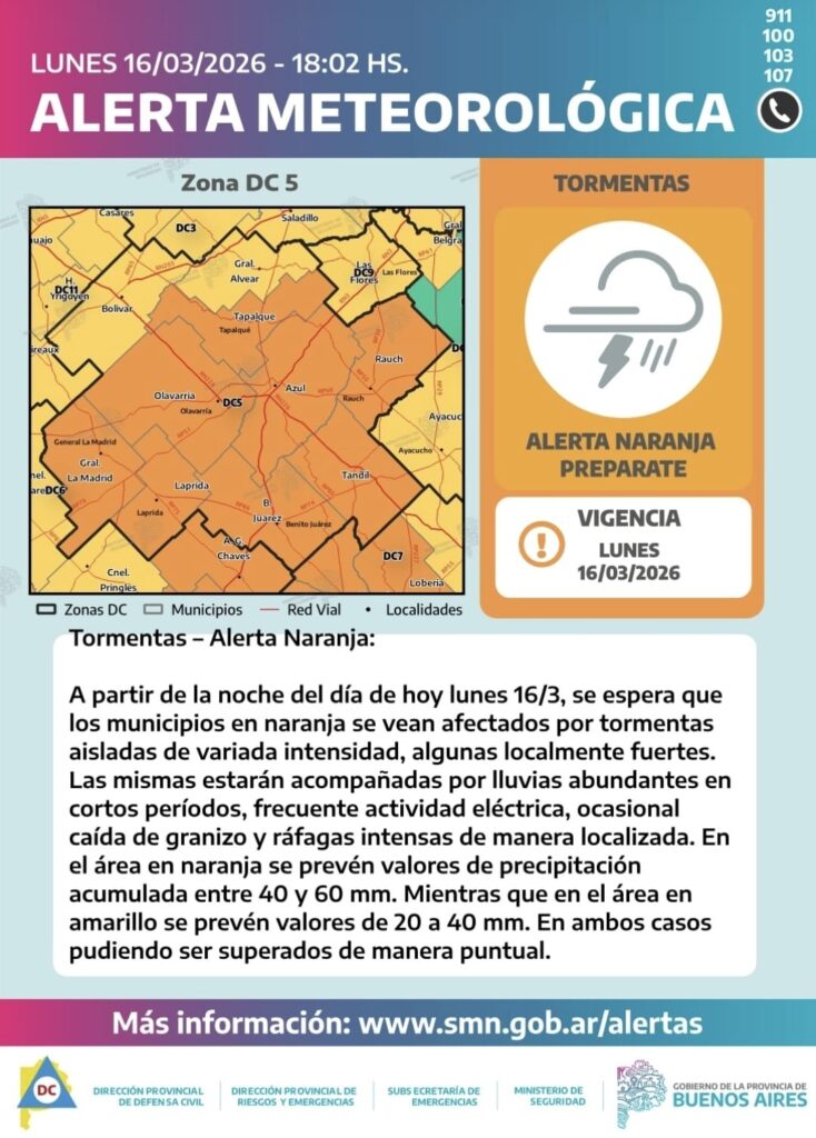 La Defensa Civil Rauch difundió este lunes un aviso de alerta meteorológica que alcanza a la ciudad de Rauch y a gran parte de la región, ante la probabilidad de tormentas de variada intensidad durante la noche.