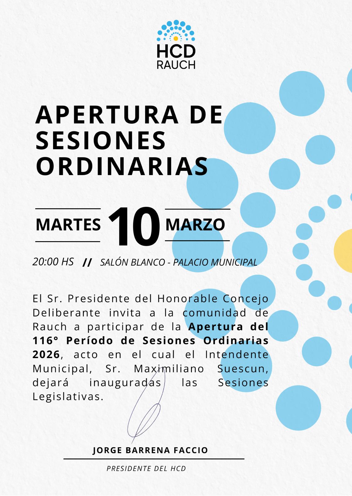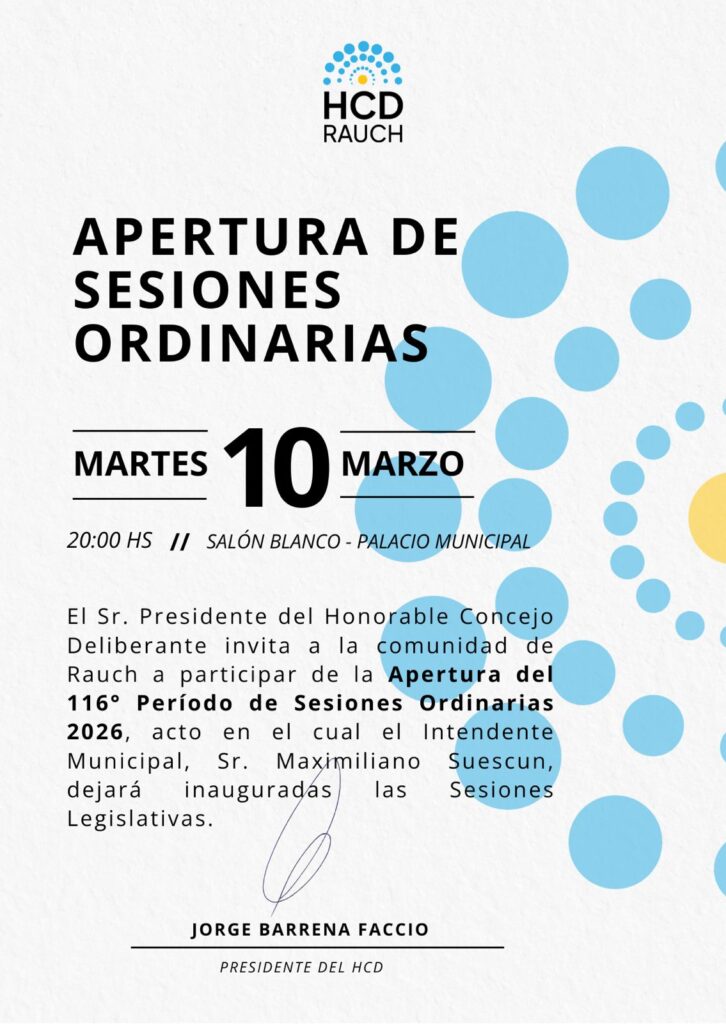El Honorable Concejo Deliberante de Rauch dará inicio este martes 10 de marzo al 116° período de sesiones ordinarias. El acto se llevará a cabo a las 20 horas en el Salón Blanco del Palacio Municipal.