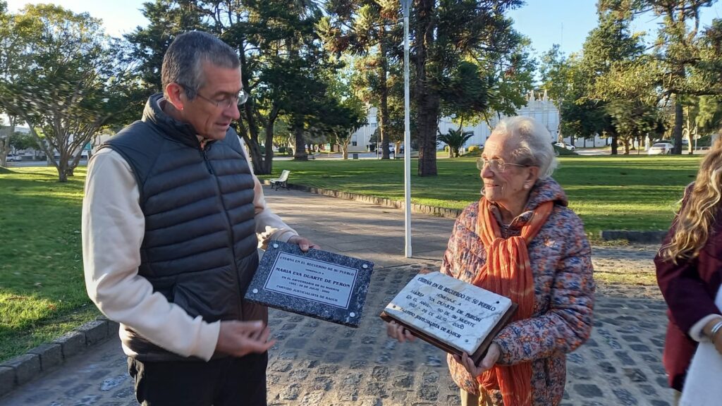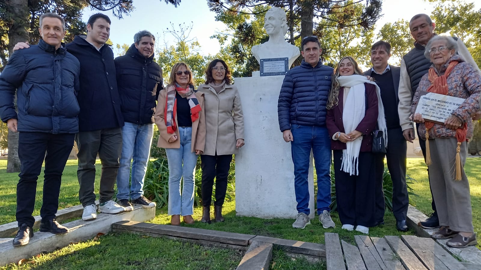 En la mañana de hoy, el intendente municipal Maximiliano Suescun, junto al intendente del partido de General Viamonte, Franco Flexas, y al secretario de Planificación, Mario Ibargoyen, acompañó a las autoridades del PJ local en el acto de reposición de la placa del busto de Eva Perón, ubicado en Plaza Mitre.