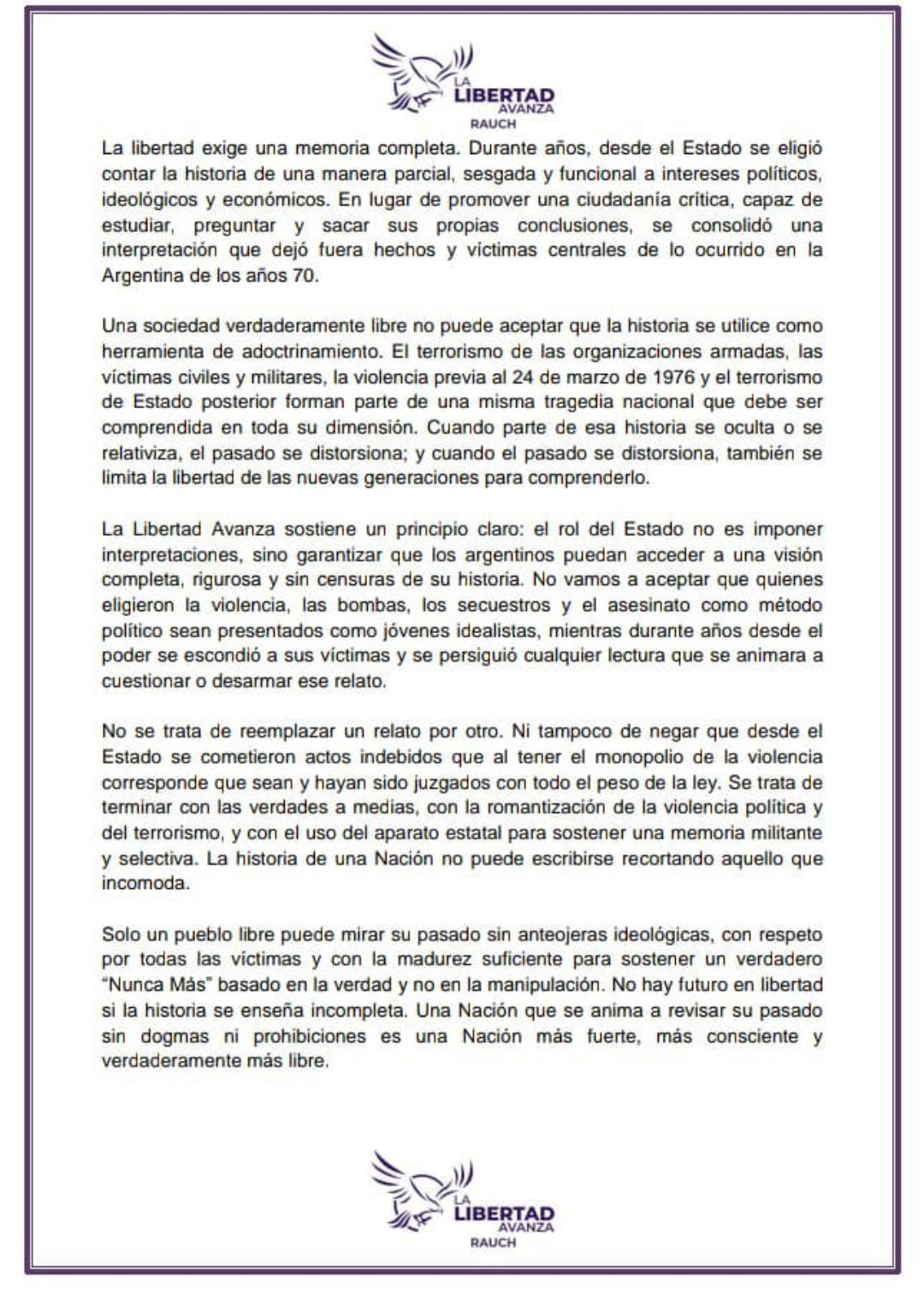 El documento plantea que una sociedad libre debe poder analizar su pasado sin condicionamientos ideológicos y afirma que tanto el accionar de organizaciones armadas como el terrorismo de Estado posterior al golpe del 24 de marzo de 1976 forman parte de una misma tragedia nacional que debe ser comprendida en toda su dimensión.Asimismo, desde La Libertad Avanza Rauch se sostiene que el rol del Estado no debe ser imponer interpretaciones históricas, sino garantizar que los ciudadanos puedan acceder a una visión “completa, rigurosa y sin censuras” de la historia del país.