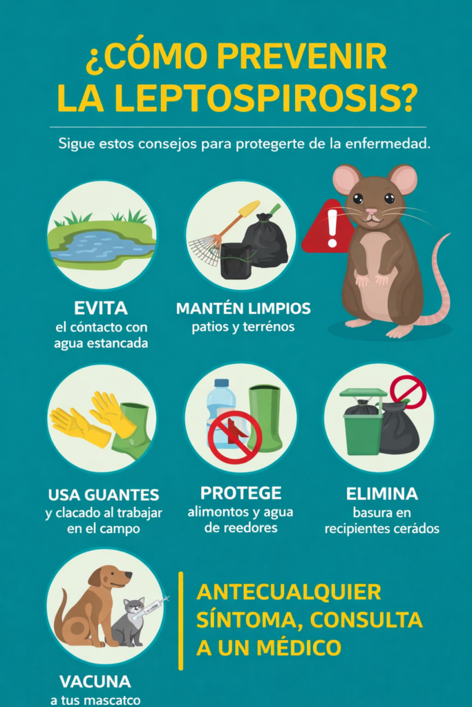.Cómo prevenir la leptospirosisLas principales medidas de prevención incluyen:Evitar el contacto con agua estancada o potencialmente contaminada.Usar botas y guantes al trabajar en zonas húmedas o rurales.Mantener patios y terrenos limpios, sin acumulación de basura.Guardar los alimentos en recipientes cerrados.Controlar la presencia de roedores en viviendas y galpones.Mantener vacunadas a las mascotas, especialmente los perros.Las autoridades sanitarias recuerdan que la prevención y la consulta médica temprana son claves para evitar complicaciones ante esta enfermedad.