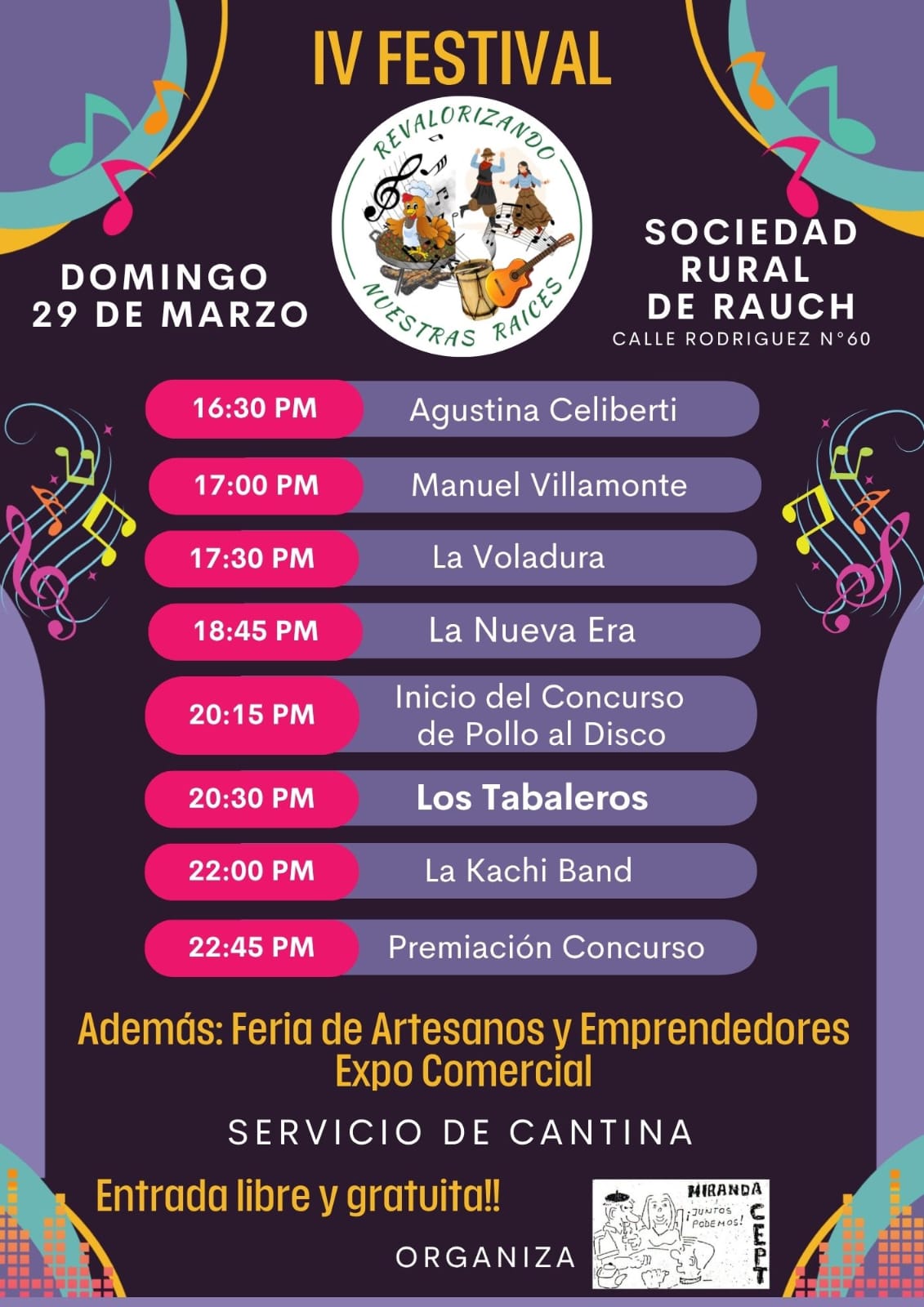 Sobre el escenario, la música será protagonista con una grilla variada que incluye a Agustina Celiberti, Manuel Villamonte, la agrupación La Fortinera, La Voladura de Ayacucho y el cierre a puro ritmo con La Nueva Era y La Kachi Band, mientras que Los Tabaleros se presentan como uno de los números centrales.
