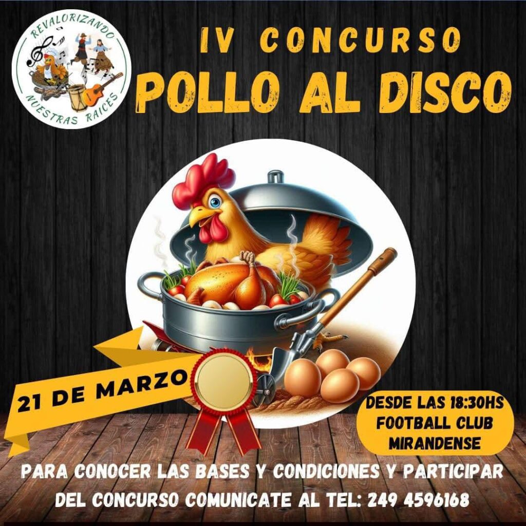 El sábado 21 de marzo, desde las 18:30, se realizará una nueva edición del festival “Revalorizando Nuestras Raíces” en el Football Club Mirandense, con entrada libre y gratuita, espectáculos musicales y la cuarta edición del tradicional Concurso del Pollo al Disco.