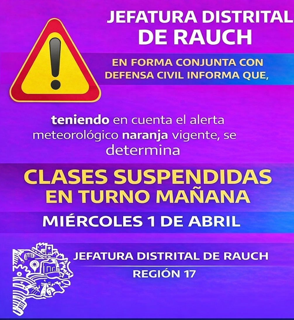 Debido a las condiciones climáticas adversas y el alerta naranja vigente, se resolvió suspender las clases del turno mañana de este miércoles en todos los establecimientos educativos de Rauch.